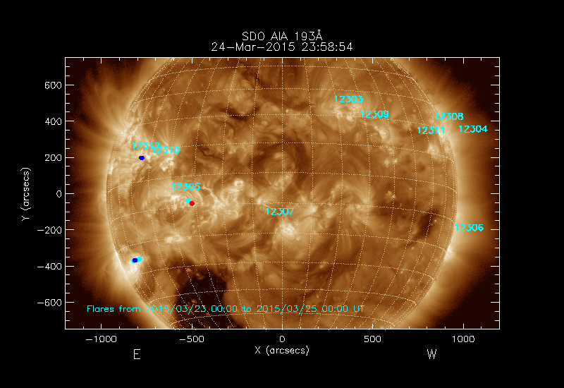 The most recent flares (≤12 hours) are shown as red dots, 12-24 hours ago as blue dots and older ones as turquoise dots.