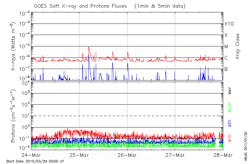 This page provides light-curves generated from GOES soft X-ray and Particle data for the date indicated at the top and the preceding three days.