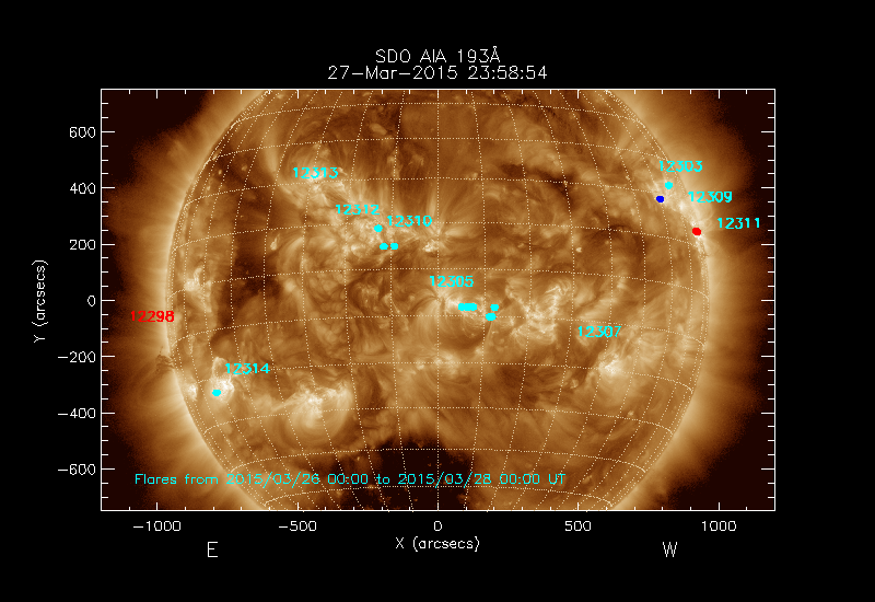 The most recent flares (≤12 hours) are shown as red dots, 12-24 hours ago as blue dots and older ones as turquoise dots.