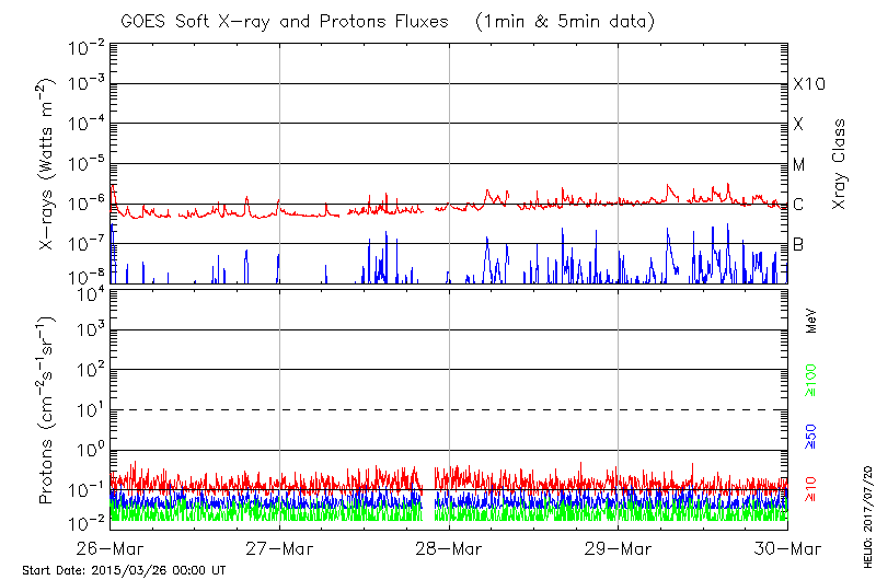 This page provides light-curves generated from GOES soft X-ray and Particle data for the date indicated at the top and the preceding three days.