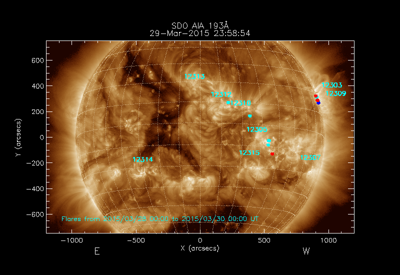 The most recent flares (≤12 hours) are shown as red dots, 12-24 hours ago as blue dots and older ones as turquoise dots.