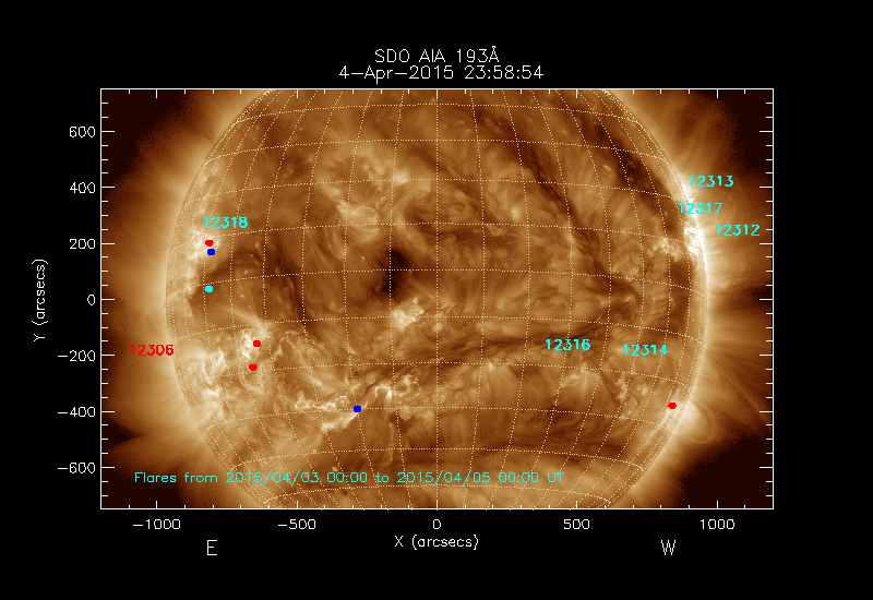 The most recent flares (≤12 hours) are shown as red dots, 12-24 hours ago as blue dots and older ones as turquoise dots.