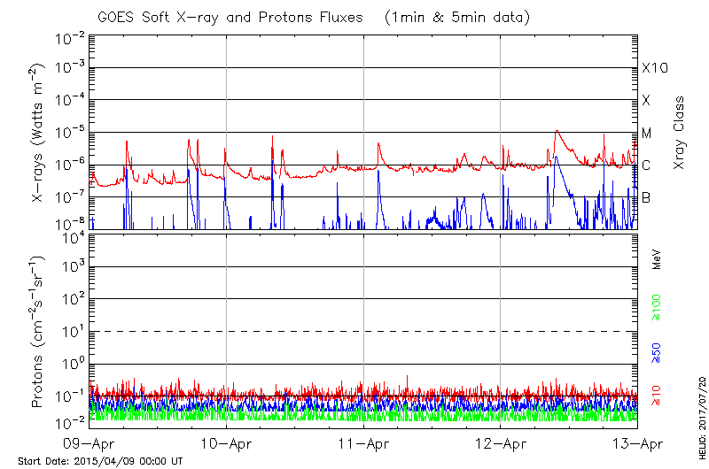 This page provides light-curves generated from GOES soft X-ray and Particle data for the date indicated at the top and the preceding three days.