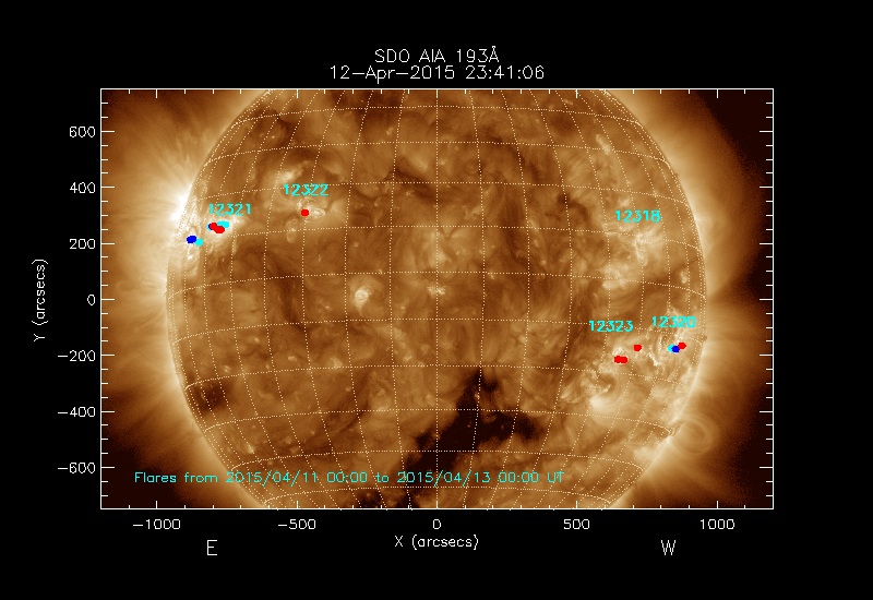 The most recent flares (≤12 hours) are shown as red dots, 12-24 hours ago as blue dots and older ones as turquoise dots.