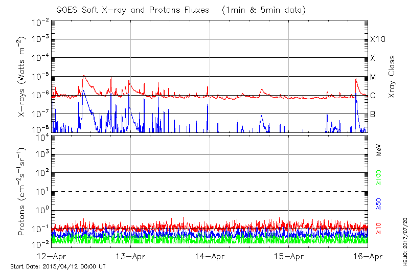 This page provides light-curves generated from GOES soft X-ray and Particle data for the date indicated at the top and the preceding three days.