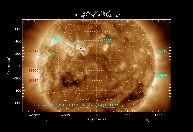 The most recent flares (≤12 hours) are shown as red dots, 12-24 hours ago as blue dots and older ones as turquoise dots.