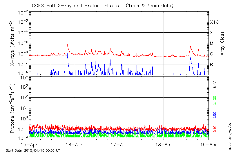 This page provides light-curves generated from GOES soft X-ray and Particle data for the date indicated at the top and the preceding three days.