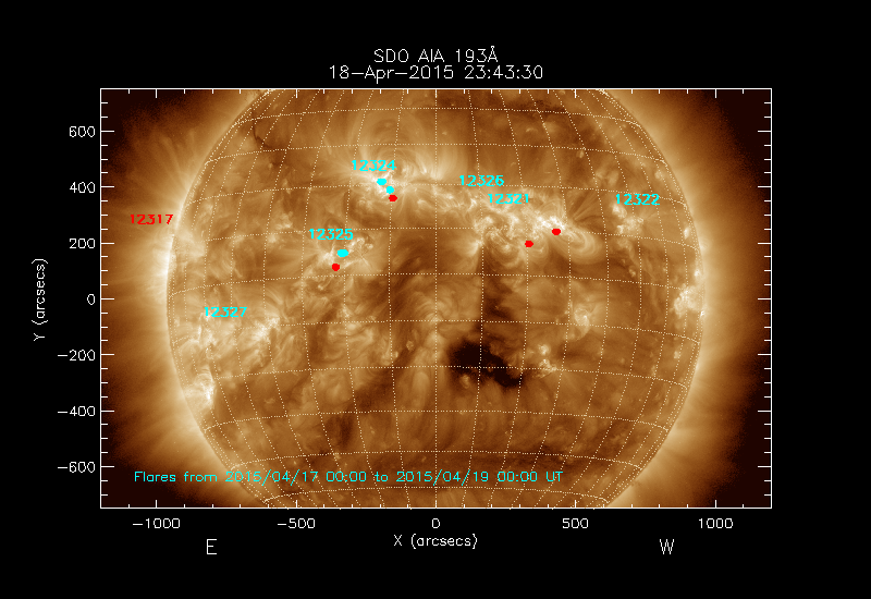 The most recent flares (≤12 hours) are shown as red dots, 12-24 hours ago as blue dots and older ones as turquoise dots.