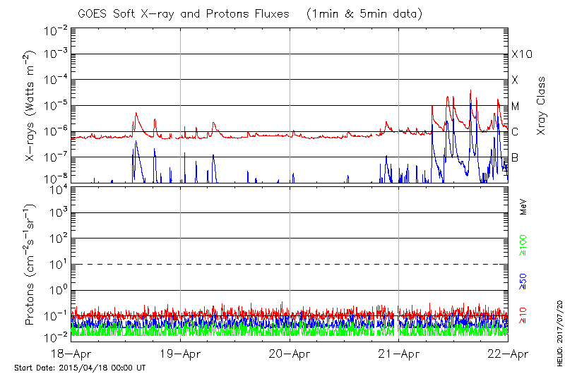 This page provides light-curves generated from GOES soft X-ray and Particle data for the date indicated at the top and the preceding three days.