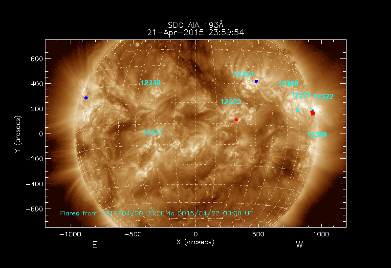 The most recent flares (≤12 hours) are shown as red dots, 12-24 hours ago as blue dots and older ones as turquoise dots.