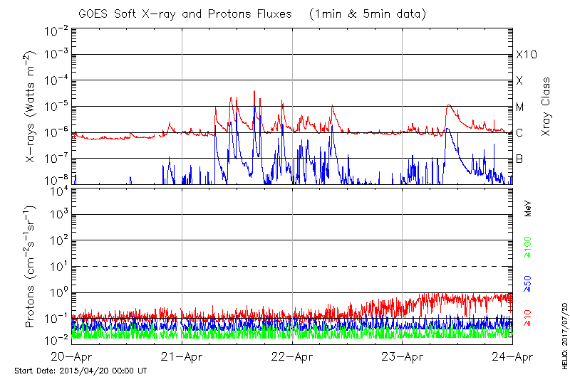 This page provides light-curves generated from GOES soft X-ray and Particle data for the date indicated at the top and the preceding three days.