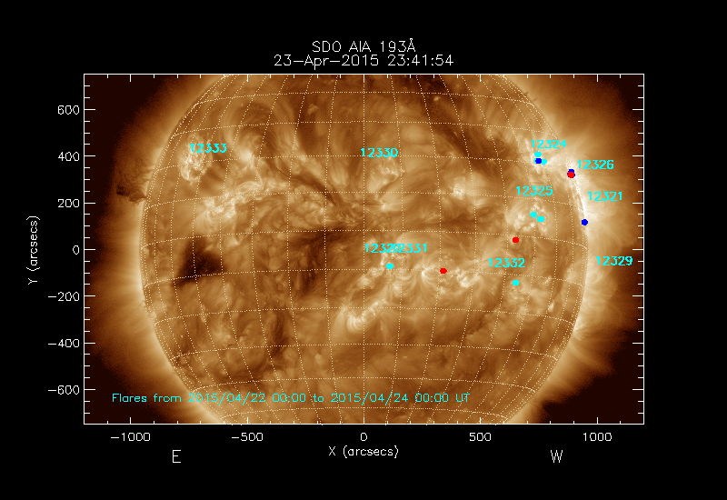 The most recent flares (≤12 hours) are shown as red dots, 12-24 hours ago as blue dots and older ones as turquoise dots.