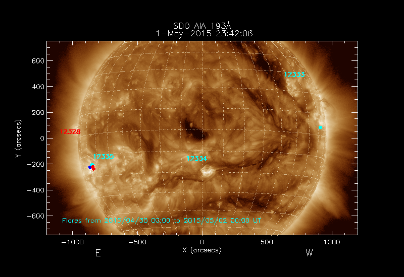 The most recent flares (≤12 hours) are shown as red dots, 12-24 hours ago as blue dots and older ones as turquoise dots.