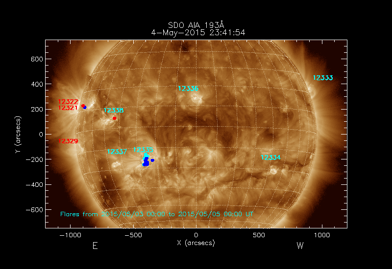 The most recent flares (≤12 hours) are shown as red dots, 12-24 hours ago as blue dots and older ones as turquoise dots.