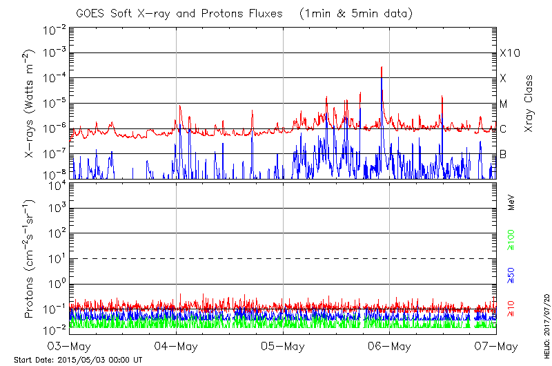 This page provides light-curves generated from GOES soft X-ray and Particle data for the date indicated at the top and the preceding three days.