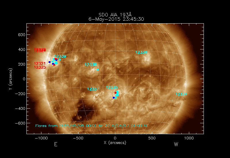 dots and 24-48 hours as turquoise dots; the flare locations are rotated to the time of the image.