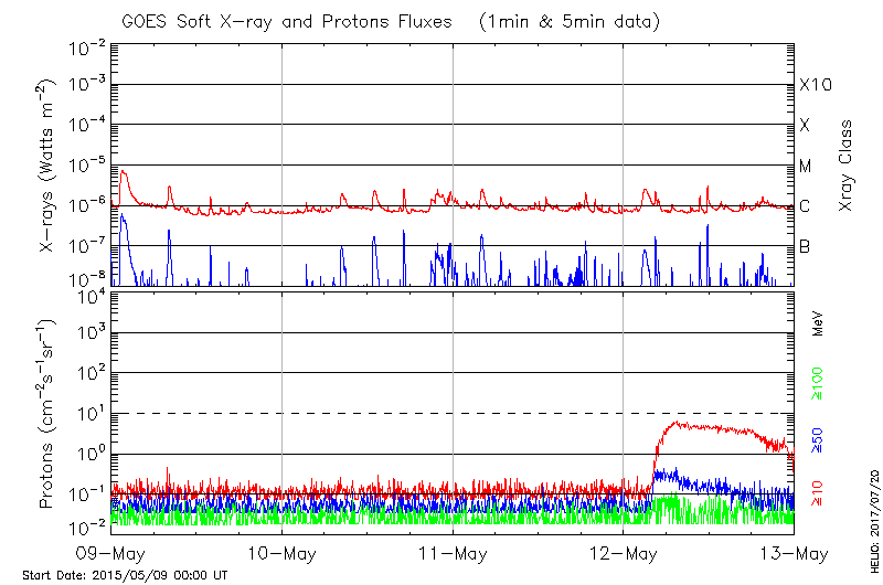 This page provides light-curves generated from GOES soft X-ray and Particle data for the date indicated at the top and the preceding three days.