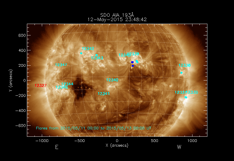 The most recent flares (≤12 hours) are shown as red dots, 12-24 hours ago as blue dots and older ones as turquoise dots.