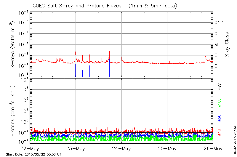 This page provides light-curves generated from GOES soft X-ray and Particle data for the date indicated at the top and the preceding three days.