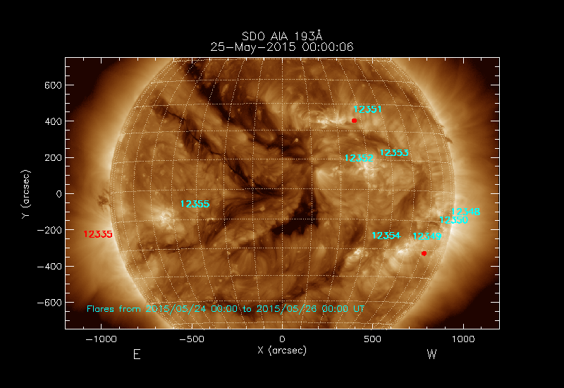 Click on an Active Region plot to display the Region Report including the region evolution and flaring history. HEC Search for NOAA Active Regions (SRS) records for this date and the day before.