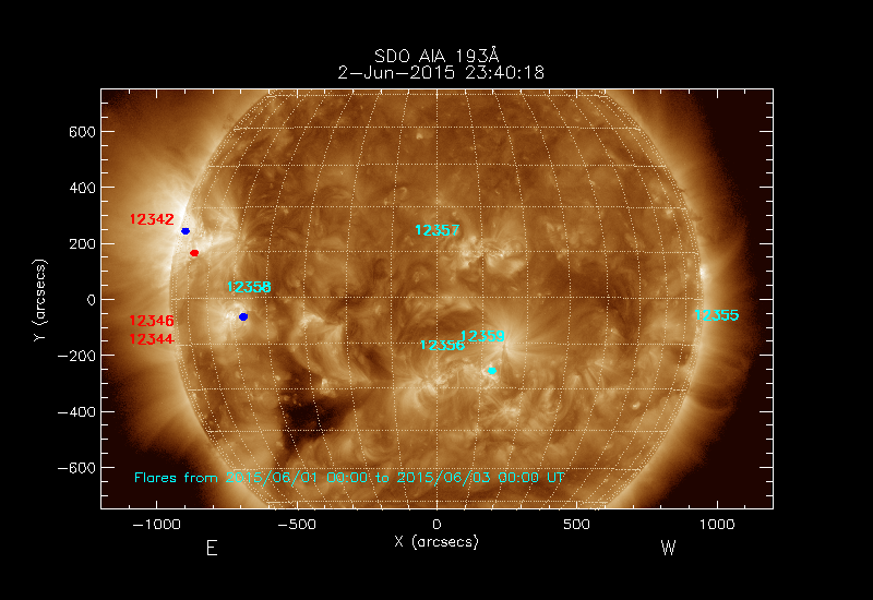 The locations of the flares over-plotted on the image are derived from the flare catalogue