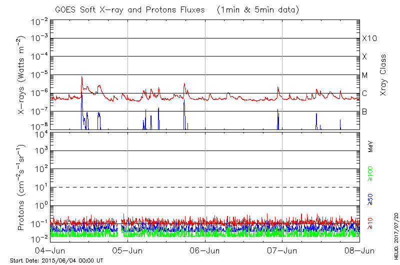 This page provides light-curves generated from GOES soft X-ray and Particle data for the date indicated at the top and the preceding three days.