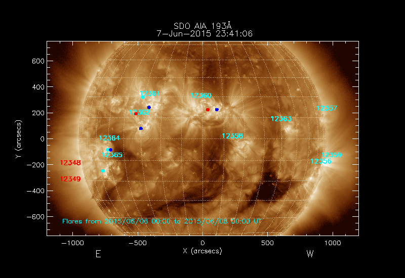 The locations of the flares over-plotted on the image are derived from the flare catalogue