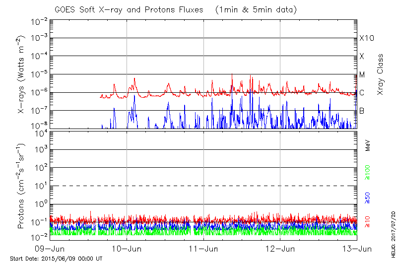This page provides light-curves generated from GOES soft X-ray and Particle data for the date indicated at the top and the preceding three days.
