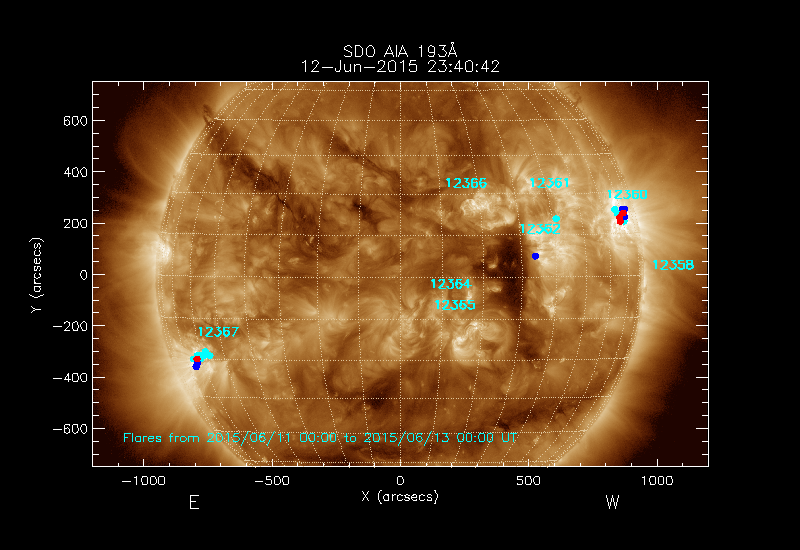 The most recent flares (≤12 hours) are shown as red dots, 12-24 hours ago as blue dots and older ones as turquoise dots.