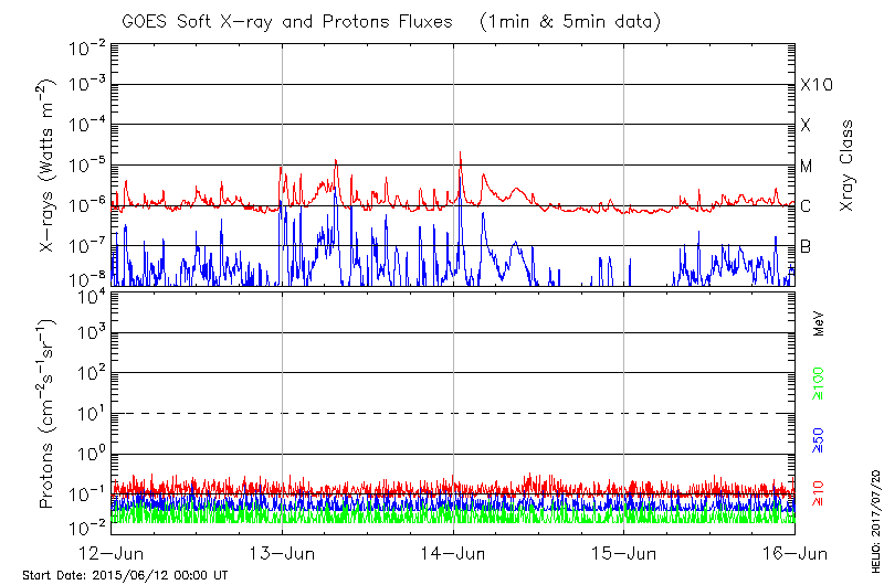 This page provides light-curves generated from GOES soft X-ray and Particle data for the date indicated at the top and the preceding three days.