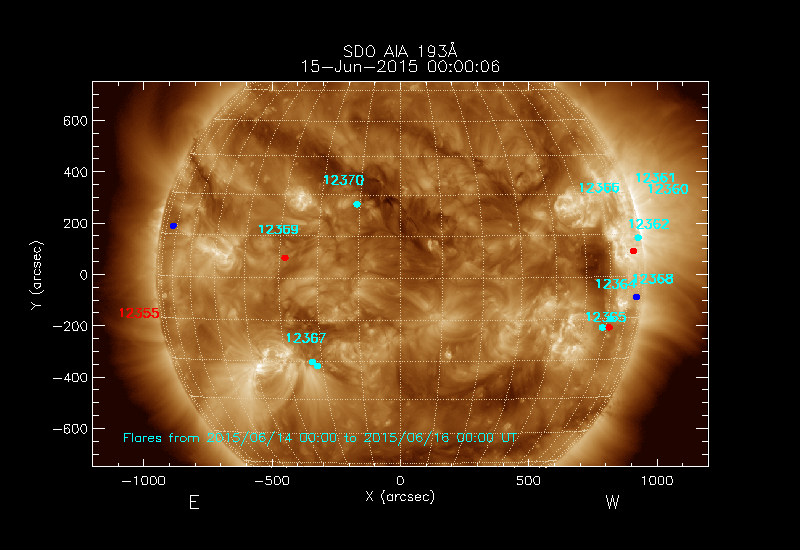 The locations of the flares over-plotted on the image are derived from the flare catalogue