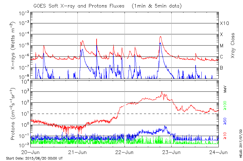 This page provides light-curves generated from GOES soft X-ray and Particle data for the date indicated at the top and the preceding three days.