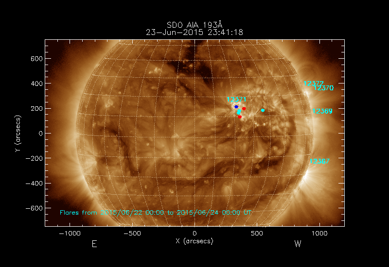 The most recent flares (≤12 hours) are shown as red dots, 12-24 hours ago as blue dots and older ones as turquoise dots.