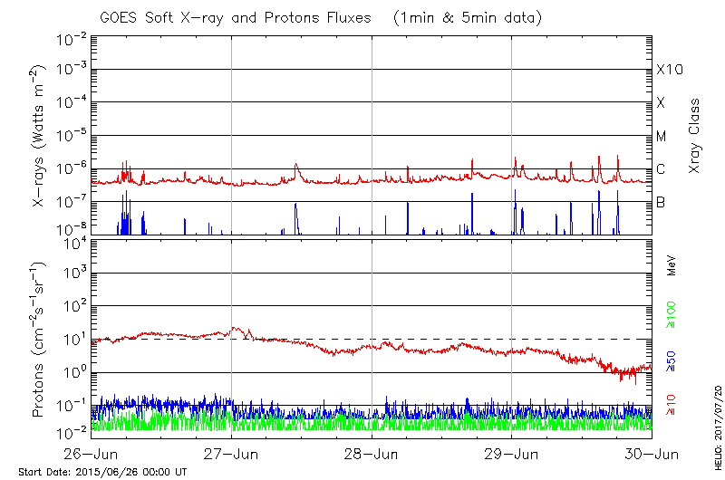 This page provides light-curves generated from GOES soft X-ray and Particle data for the date indicated at the top and the preceding three days.