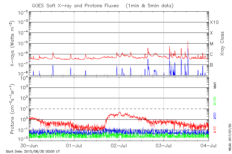This page provides light-curves generated from GOES soft X-ray and Particle data for the date indicated at the top and the preceding three days.