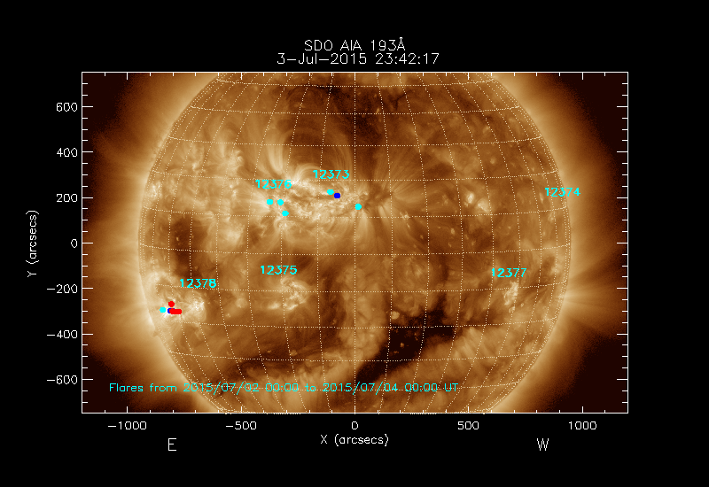 The locations of the flares over-plotted on the image are derived from the flare catalogue