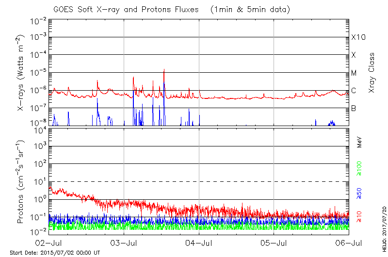 This page provides light-curves generated from GOES soft X-ray and Particle data for the date indicated at the top and the preceding three days.