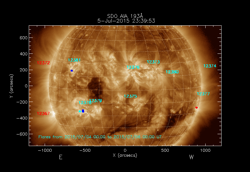The locations of the flares over-plotted on the image are derived from the flare catalogue