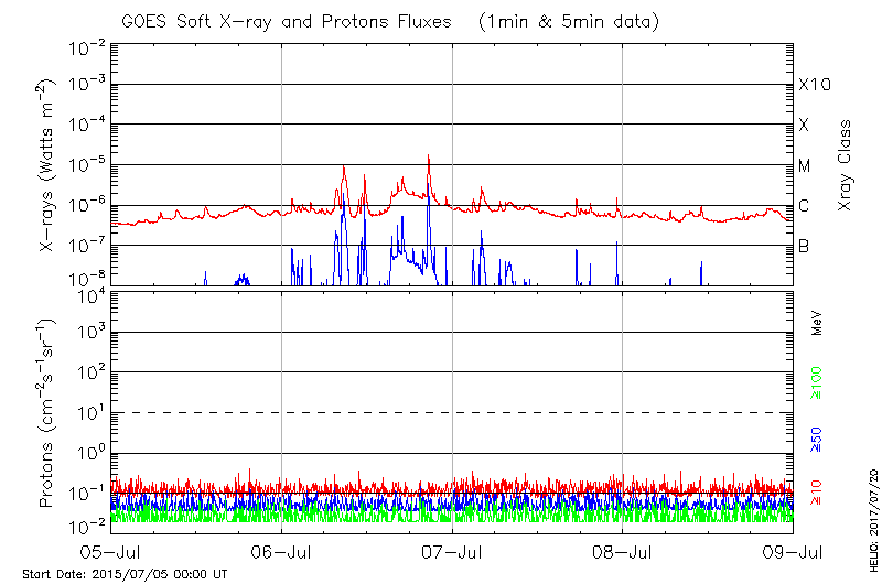 This page provides light-curves generated from GOES soft X-ray and Particle data for the date indicated at the top and the preceding three days.