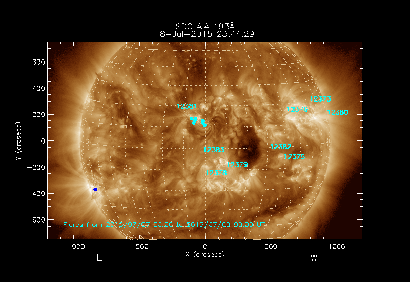 The locations of the flares over-plotted on the image are derived from the flare catalogue