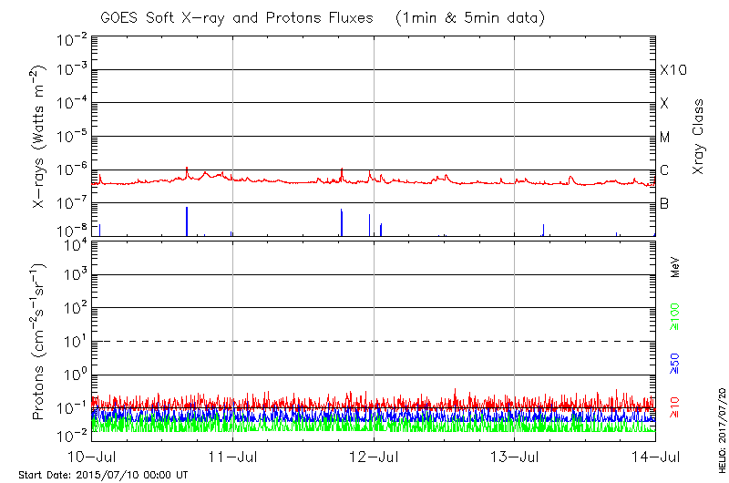 This page provides light-curves generated from GOES soft X-ray and Particle data for the date indicated at the top and the preceding three days.