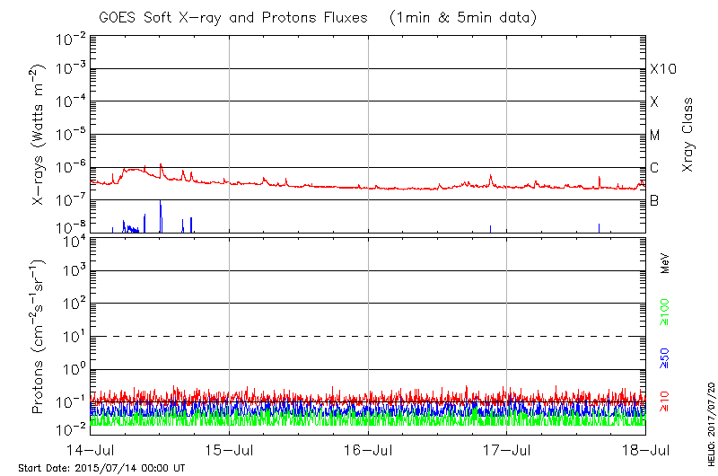 This page provides light-curves generated from GOES soft X-ray and Particle data for the date indicated at the top and the preceding three days.