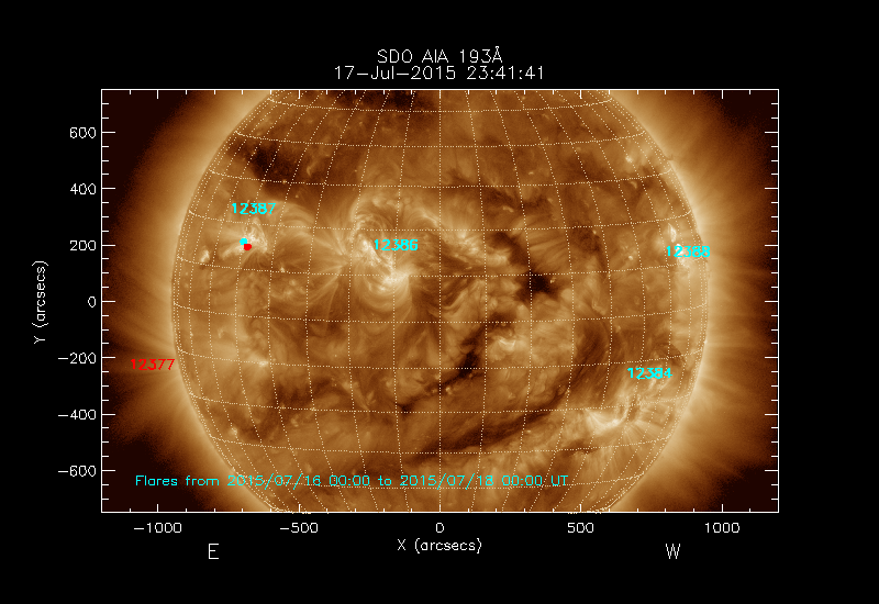 The most recent flares (≤12 hours) are shown as red dots, 12-24 hours ago as blue dots and older ones as turquoise dots.