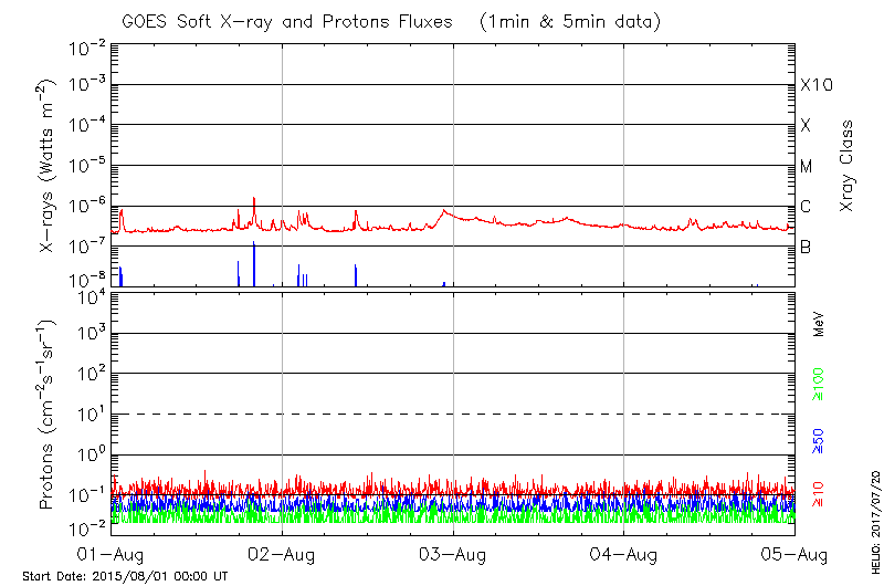 This page provides light-curves generated from GOES soft X-ray and Particle data for the date indicated at the top and the preceding three days.