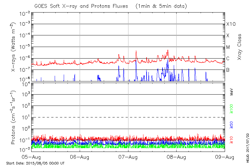 This page provides light-curves generated from GOES soft X-ray and Particle data for the date indicated at the top and the preceding three days.