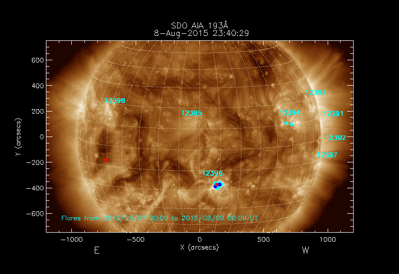 All soft X-ray flares (≥A1.0) where the location has been determined are shown; the flare locations are rotated to the time of the image
