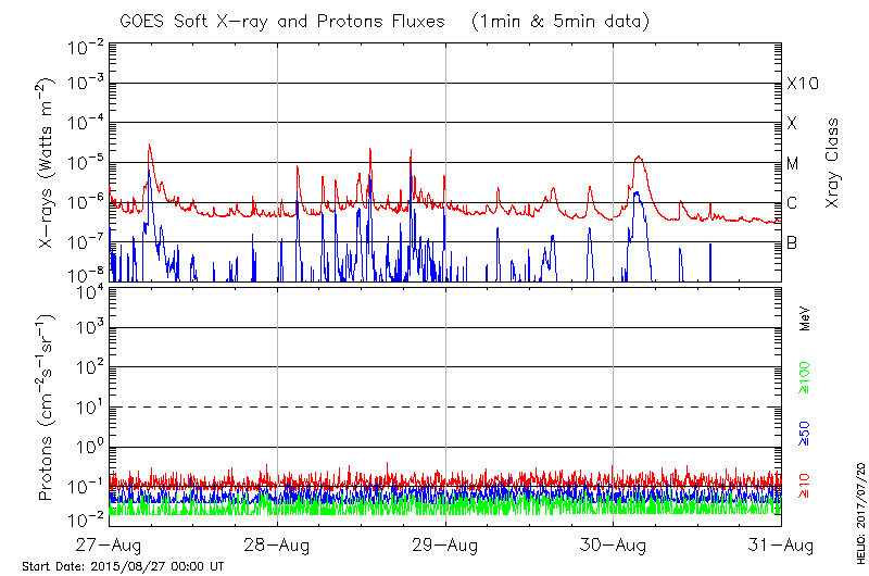 This page provides light-curves generated from GOES soft X-ray and Particle data for the date indicated at the top and the preceding three days.