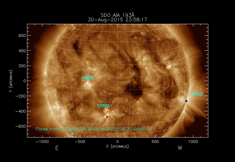 All soft X-ray flares (≥A1.0) where the location has been determined are shown; the flare locations are rotated to the time of the image