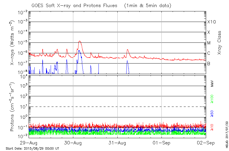This page provides light-curves generated from GOES soft X-ray and Particle data for the date indicated at the top and the preceding three days.