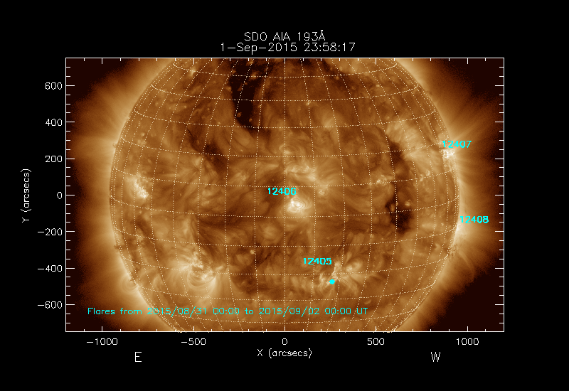 All soft X-ray flares (≥A1.0) where the location has been determined are shown; the flare locations are rotated to the time of the image